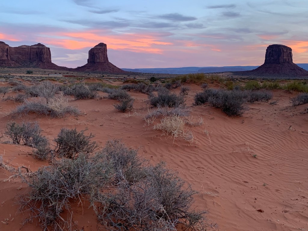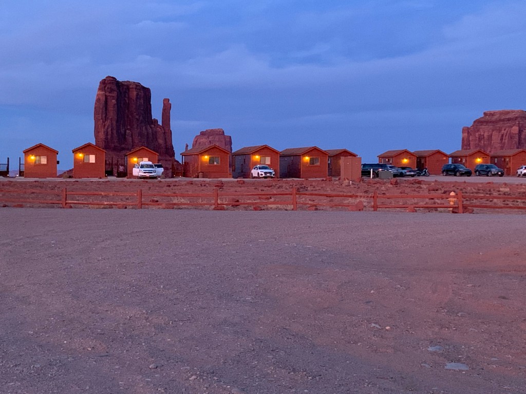 After a day at Chaco Canyon, we spent the night in Farmington, New Mexico and then on to Monument Valley. This was a special treat. Not only is it one of the most beautiful spots in the West, it has a hotel and small cabins … very small but adequate. Plus, the cabins overlook the valley of natural monuments and we were able to experience sunset and sunrise … truly amazing!