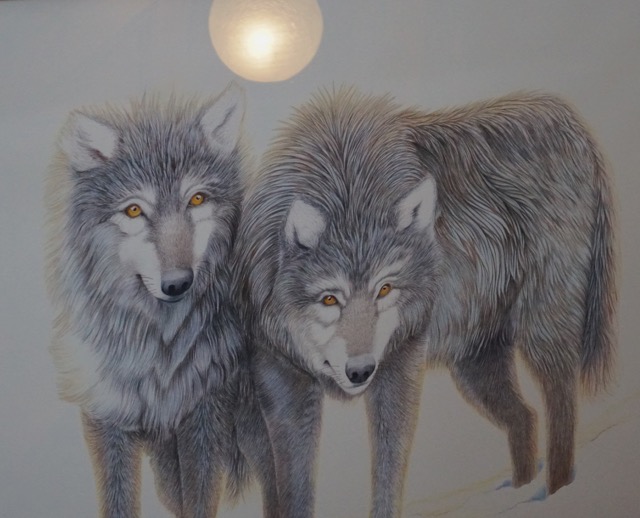 This one of the wolves is one of my favorite … especially since we did not see the wolves while in Montana in June. Just look at the detail, the eyes … strong stern look of the dominant male and the almost friendly inquisitive look of the female. Wow! Oh, Susan did not paint a moon in the scene … this was a reflection I positioned to look like a moon. Photographer’s liberty.