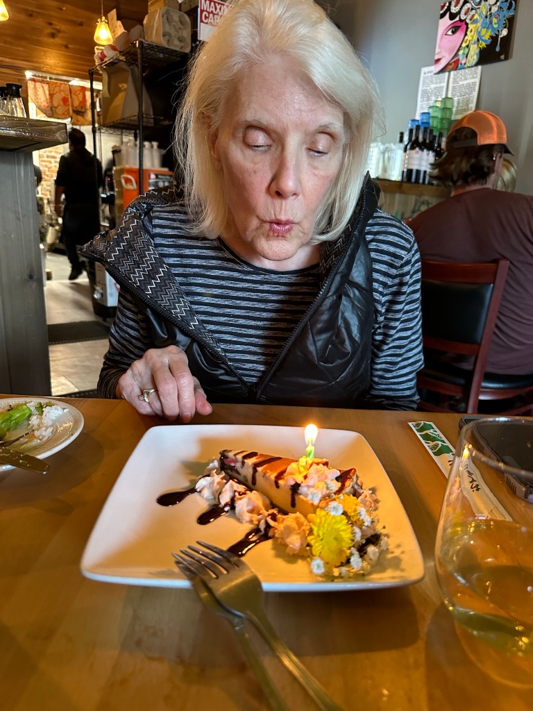 Later, went for dinner at a first class Sushi Thai restaurant. Chris brought a dessert with a candle for the special occasion.