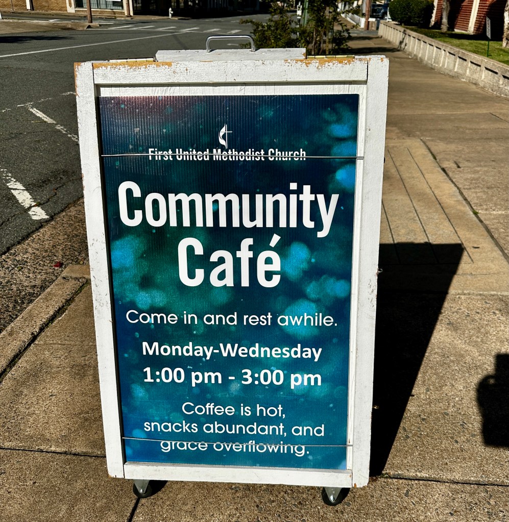 On beautiful crisp days like yesterday, I love to “get my steps in” by walking around downtown. Often, like yesterday, I make a serendipitous discovery … this time, the First United Methodist Church Community Cafe. Of course, I had to go in! What did I find? … two delightful ladies, Judy and Jane. They could almost be two lovable characters from a Doctor Seuss book. Instead they were two amazing volunteers serving coffee and snacks and an overflowing of grace and love for people in need.