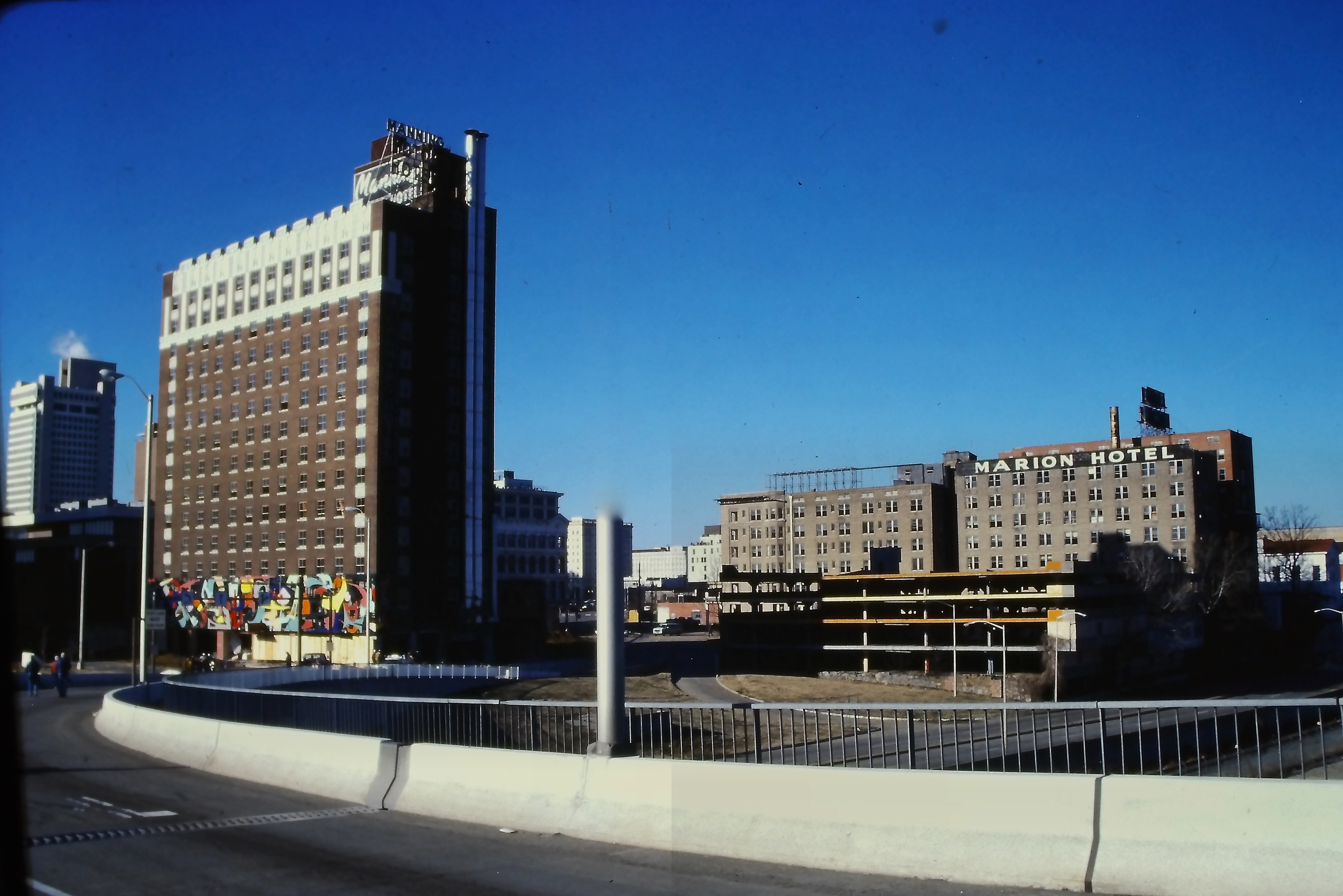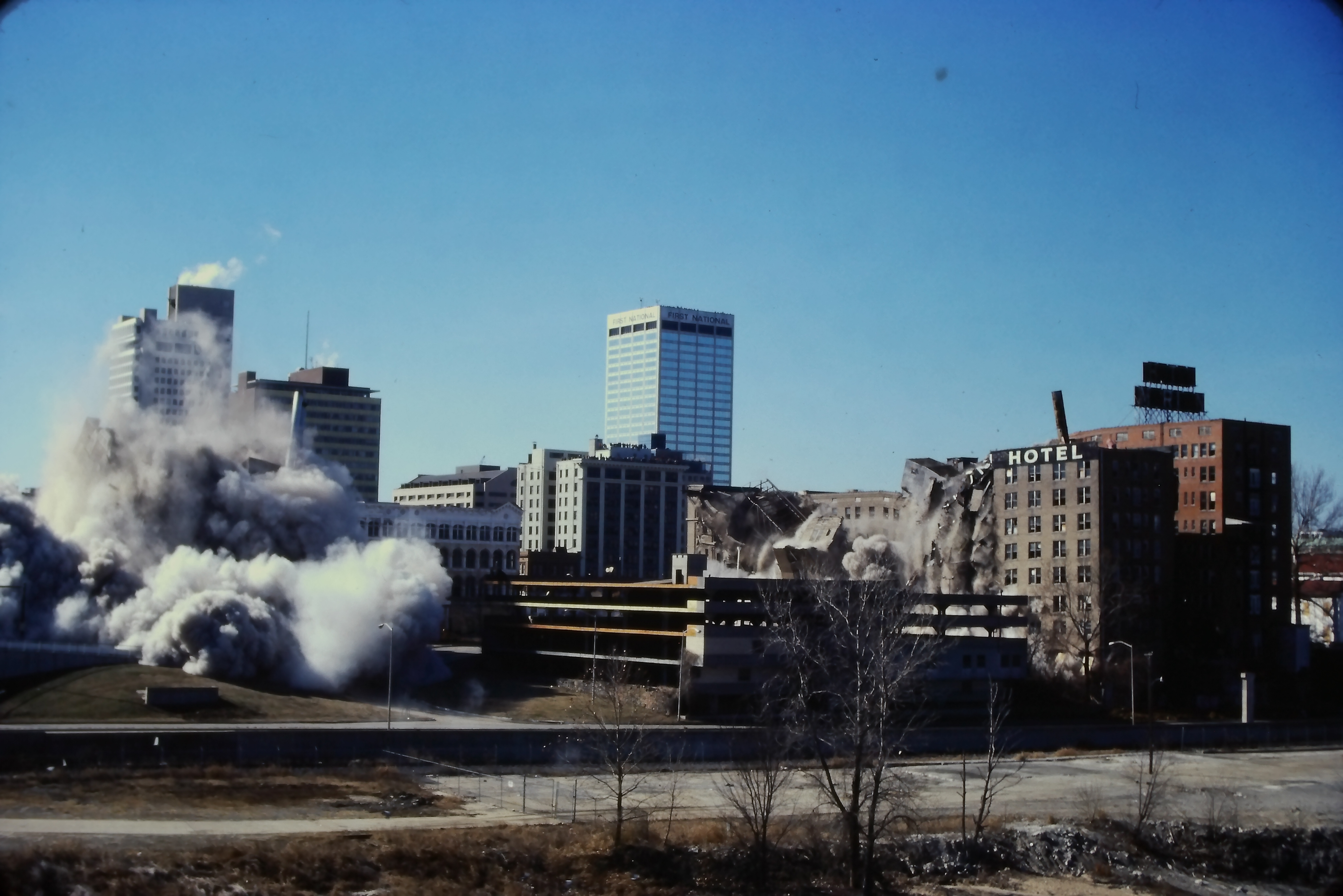 Manning and Marion moments before demolition. Note the colorful artwork on the Manning. This “design” element was an attempt mid century to cover up the past and modernize buildings. Unfortunately, too many buildings were lost during this period of “Urban renewal. Fortunately, the colorful exterior decor was later removed exposing the beautiful original historic structures.A unique family outing in downtown Little Rock. Laura, Donna, Jeff, DJ and a friend.Thousands came to witness the first major building implosion in Arkansas.It started with a puff of smoke and a loud explosion at the Manning. Hotel Marion stands in waiting.Split and crumble of the Manning.Manning going down … Hotel Marion begins to collapse Manning down … Marion faltering.Just a cloud of smoke, dust and building rubble. A palette of land awaits the new Convention Center and Convention HotelButler Center for Arkansas Studies.