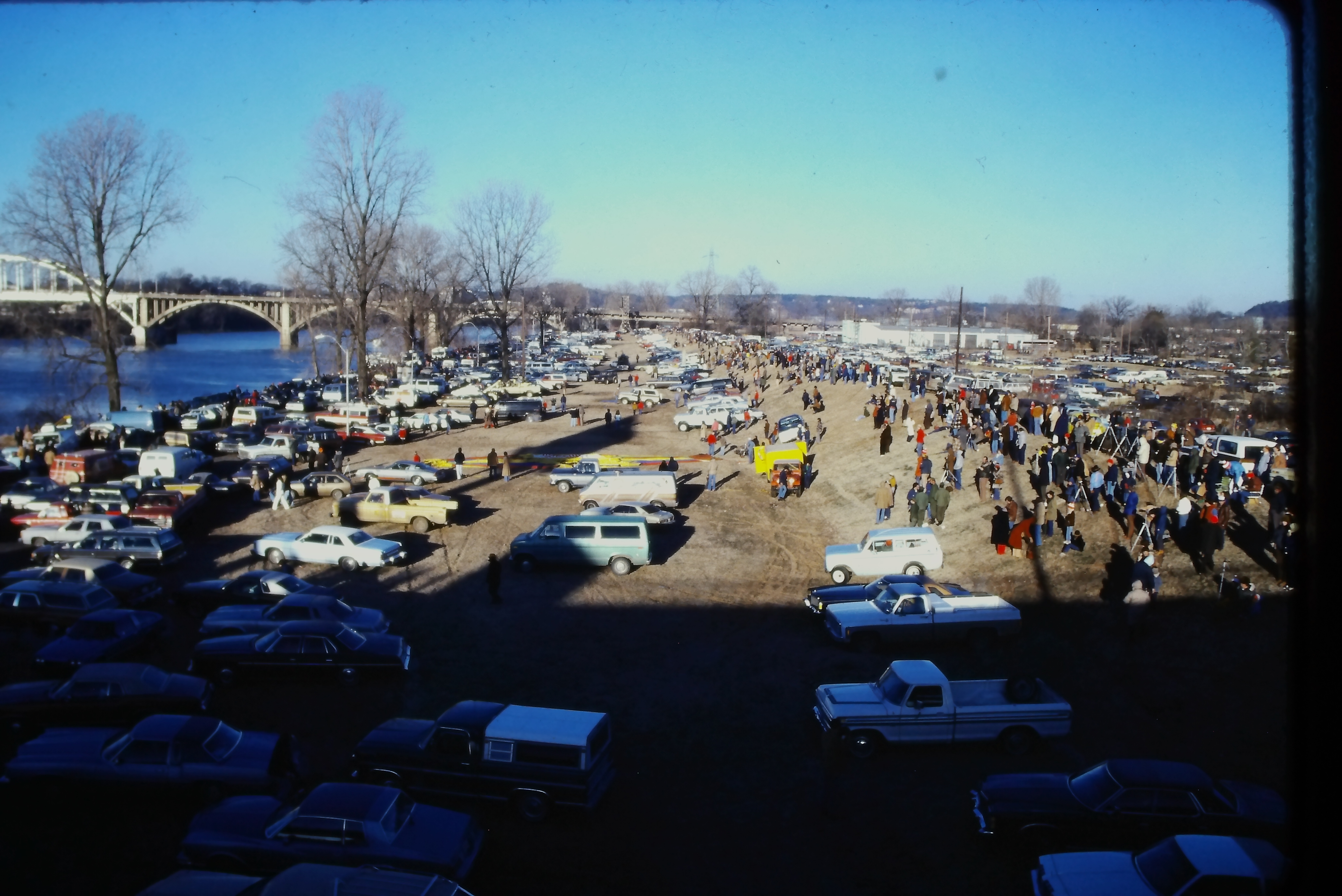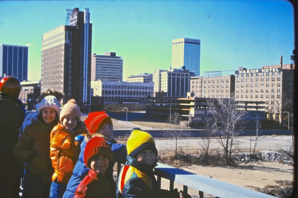 I recently discovered these old 35mm photos taken by me on a very cold day, standing on the Main Street Bridge with my family to witness the first significant implosion of large buildings in Arkansas.