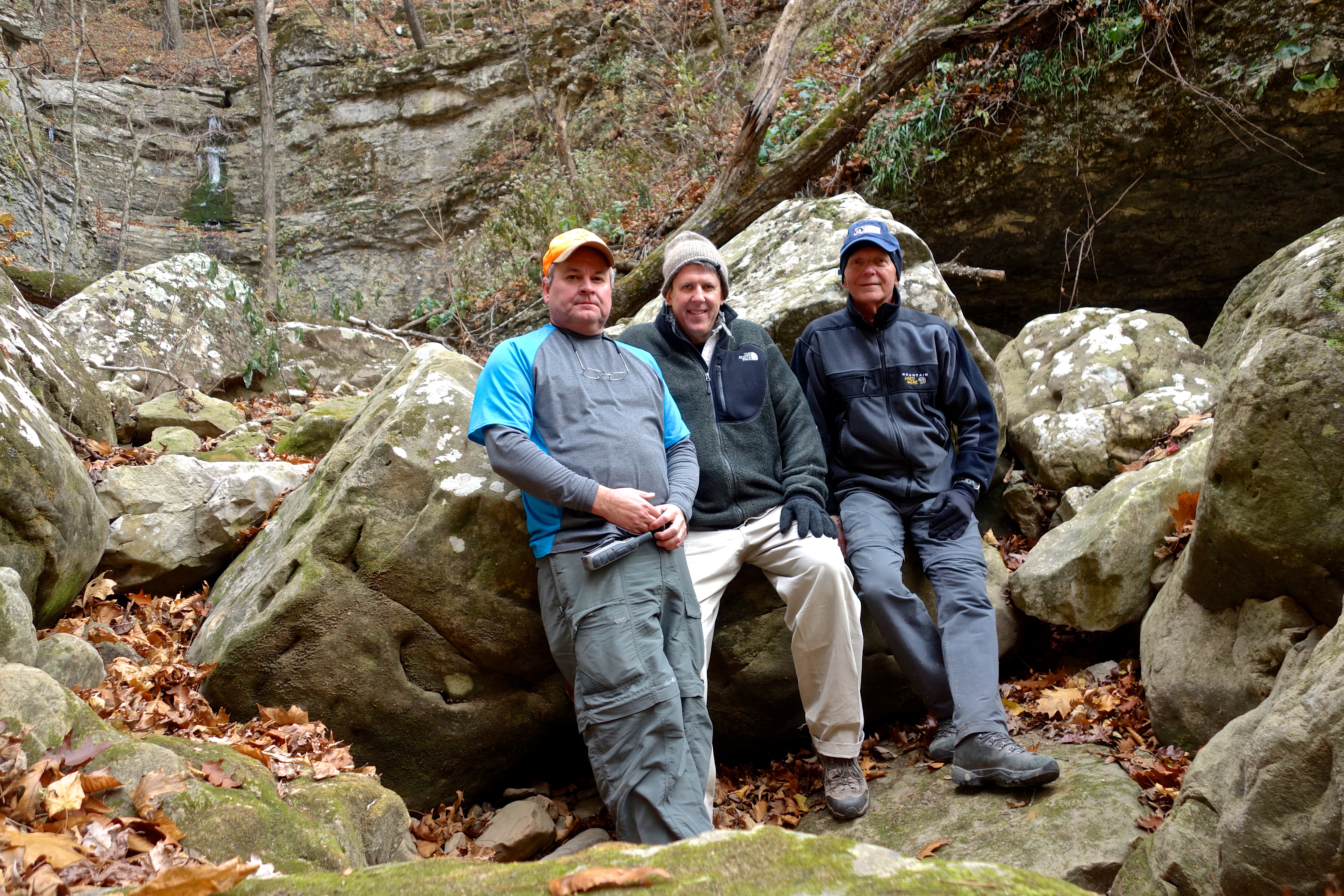 First, let me set the stage by telling you two of my buddies and I (see our photo below) were hiking in the Buffalo National River valley near Boxley, Arkansas. It was a cold morning in the mid 20’s and we were heading into a beautiful box canyon know as “The Penitentiary”. Very shortly after beginning the two mile trek into the canyon, we started seeing a forest floor dotted with these strange silky, ribbon like sculptures of delicate ice wrapped around small plant stems. Fortunately Bryan had read about them, knew what they were called so we spent countless minutes inspecting, photographing and marveling at this never before seen (at least by us) wonder of nature. I commented that whether we made it to the Penitentiary or not, this made the trip worthwhile.