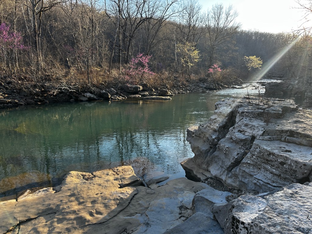 This is one of the most beautiful untouched wilderness areas in Arkansas … turquoise water, waterfalls, caves, flowering trees and naturally chiseled rock and bluff outcroppings. Even a friendly visitor below.